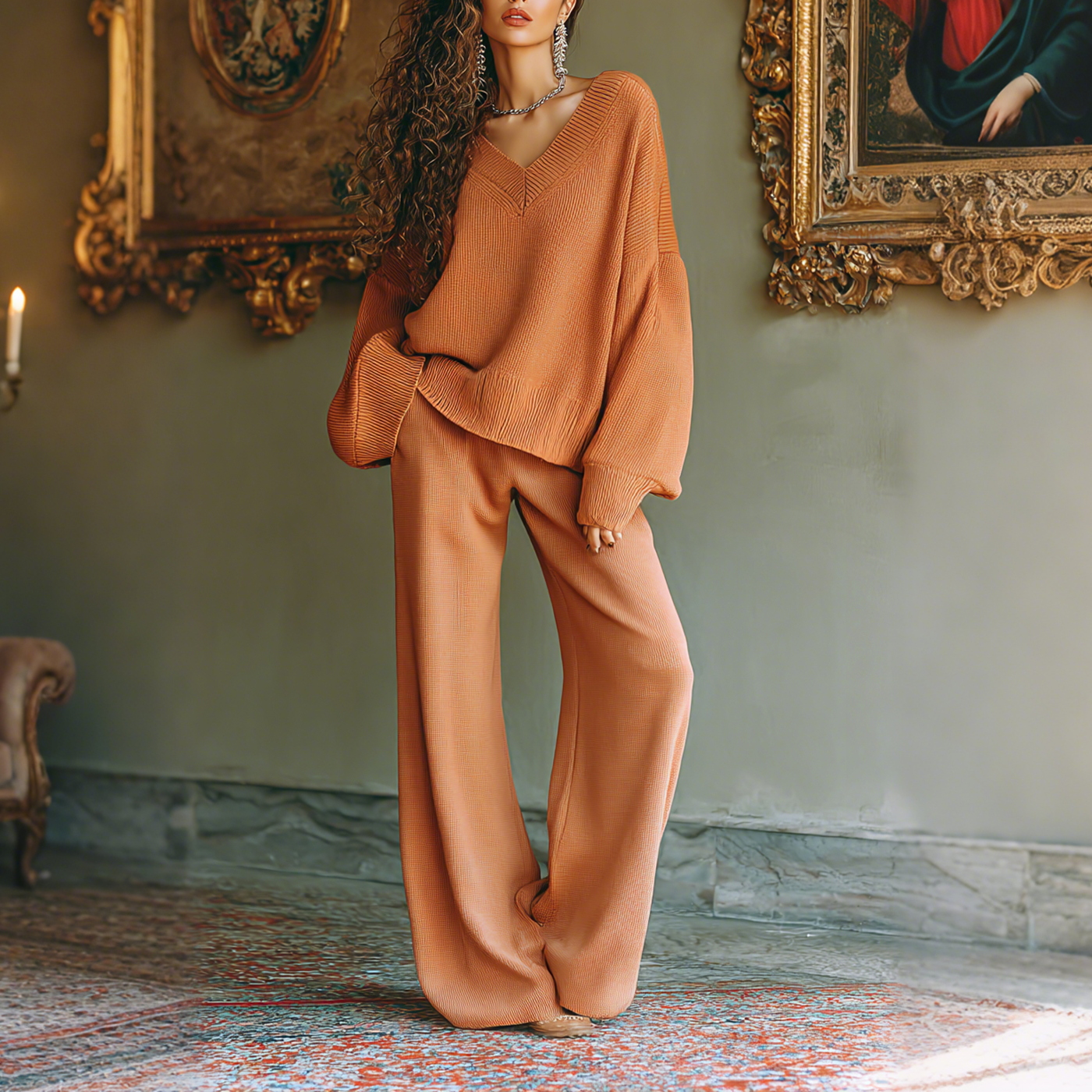• Design Elements: V-neck design, matching set style, wide-leg pants