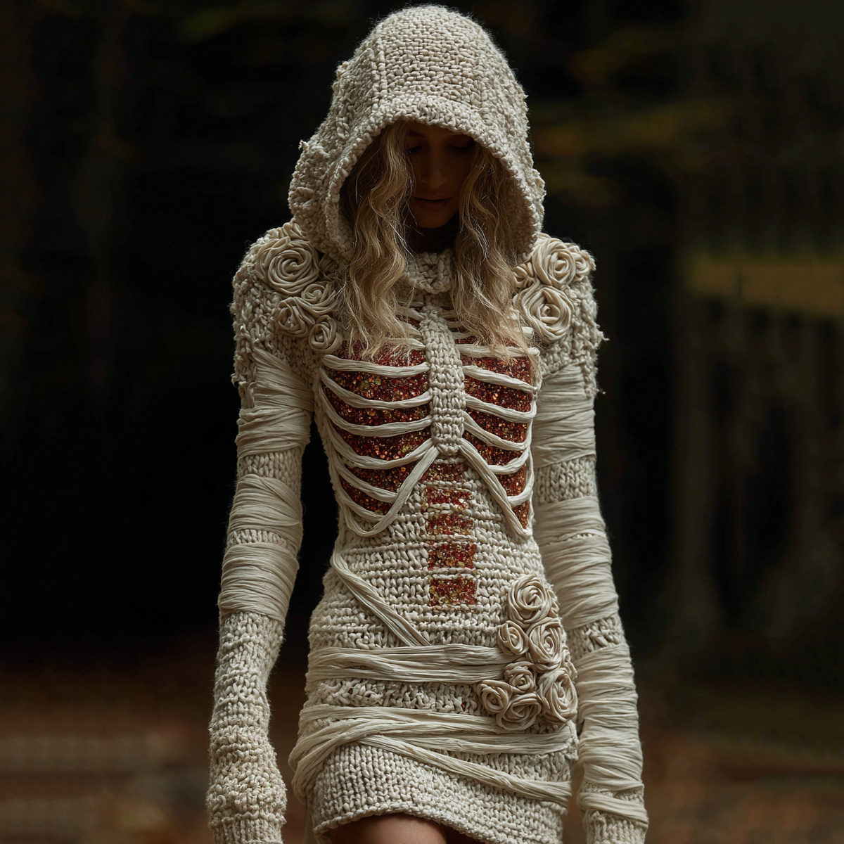 Women's Halloween Anatomy Bandage Rose Art Cozy Knit Hooded Sweater Dress