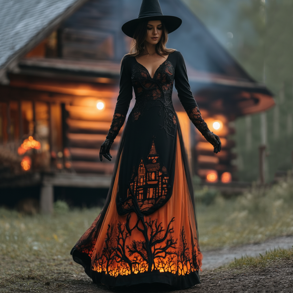 Women's Halloween Gradient Treehouse Design Witch Maxi Dress