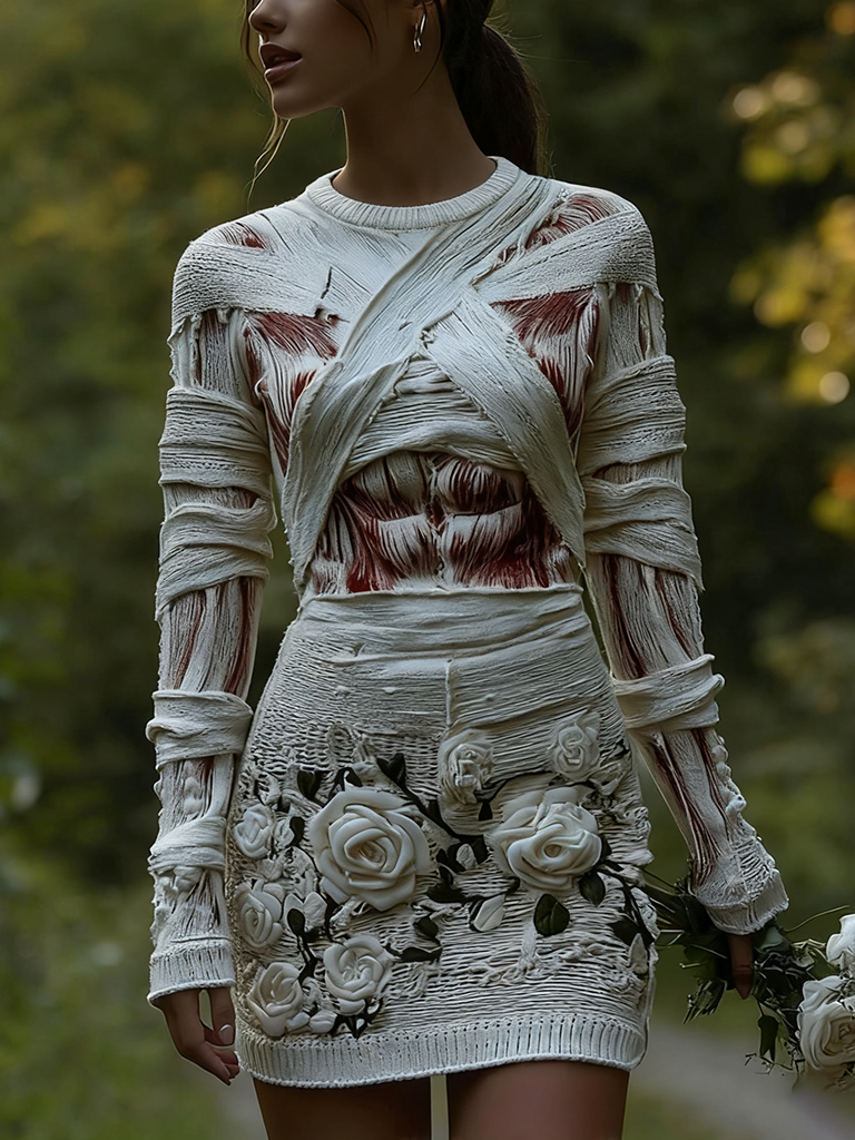 Women's Halloween Muscle Anatomy Bandage With Rose Art Cozy Knit Mini Sweater Dress