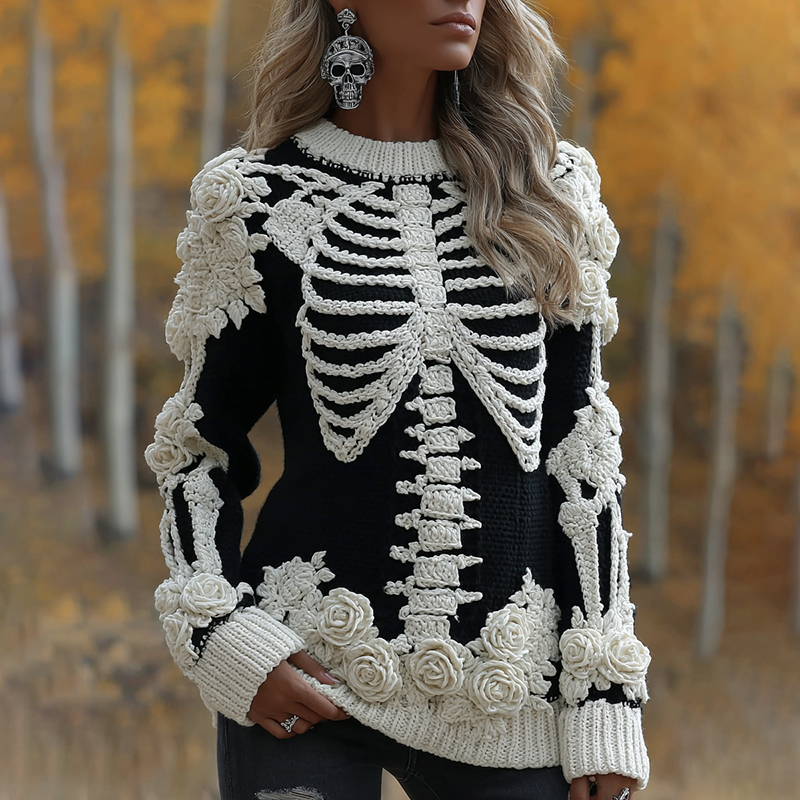 Women's Halloween Skeleton Bones With Roses Art Knitted Warm Sweater