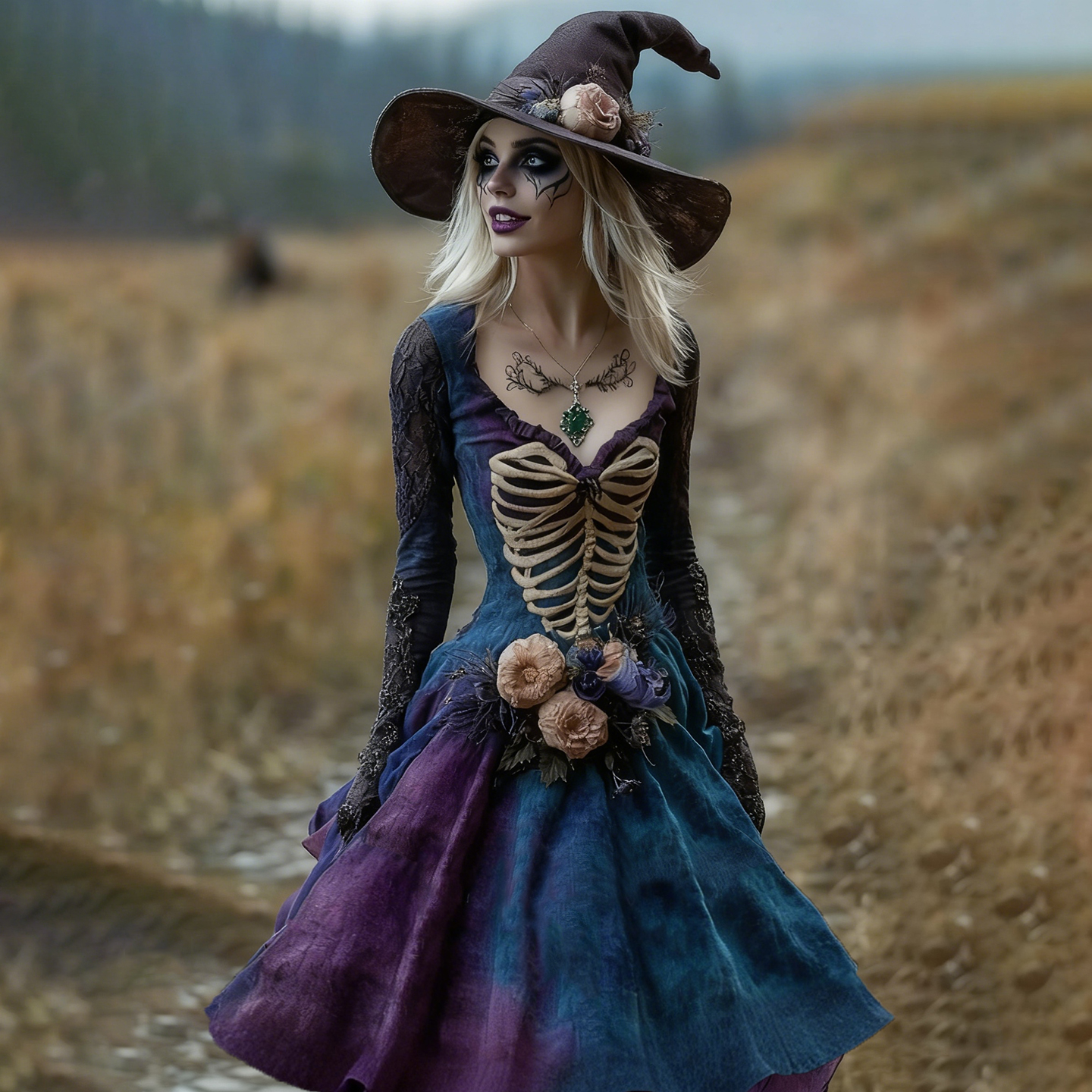 Women's Halloween Skull Floral Embroidered Ombre Linen Witch Maxi Dress