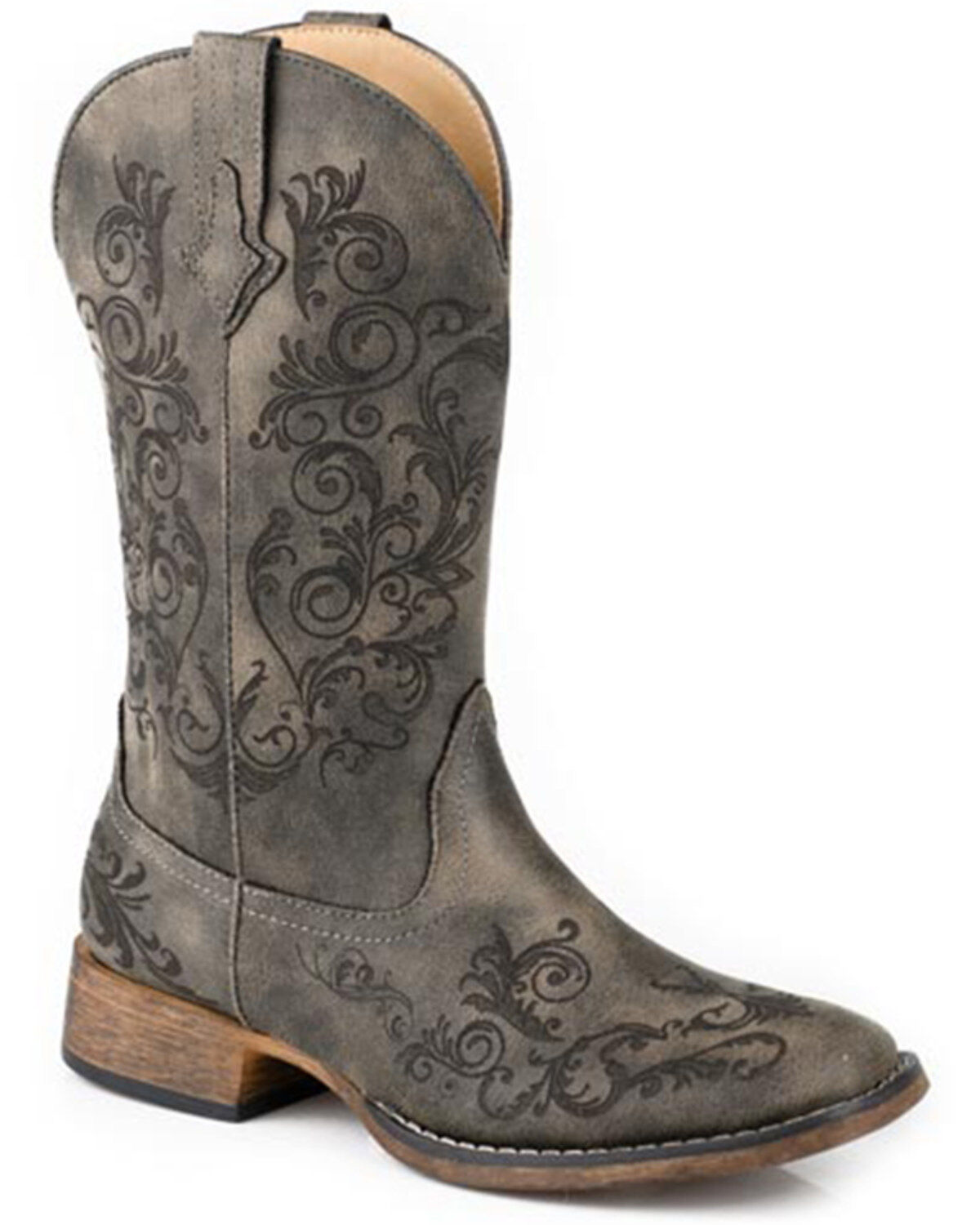 Design Details: Broad square toe, pull-on style with tabs, 11" shaft, stockman heel, laser floral embroidery