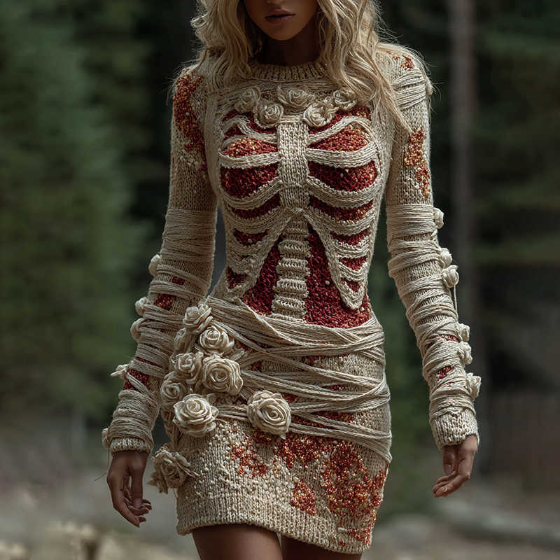 Women's Skull Anatomy Rose Sequin Bandage Art Cozy Knit Sweater Dress