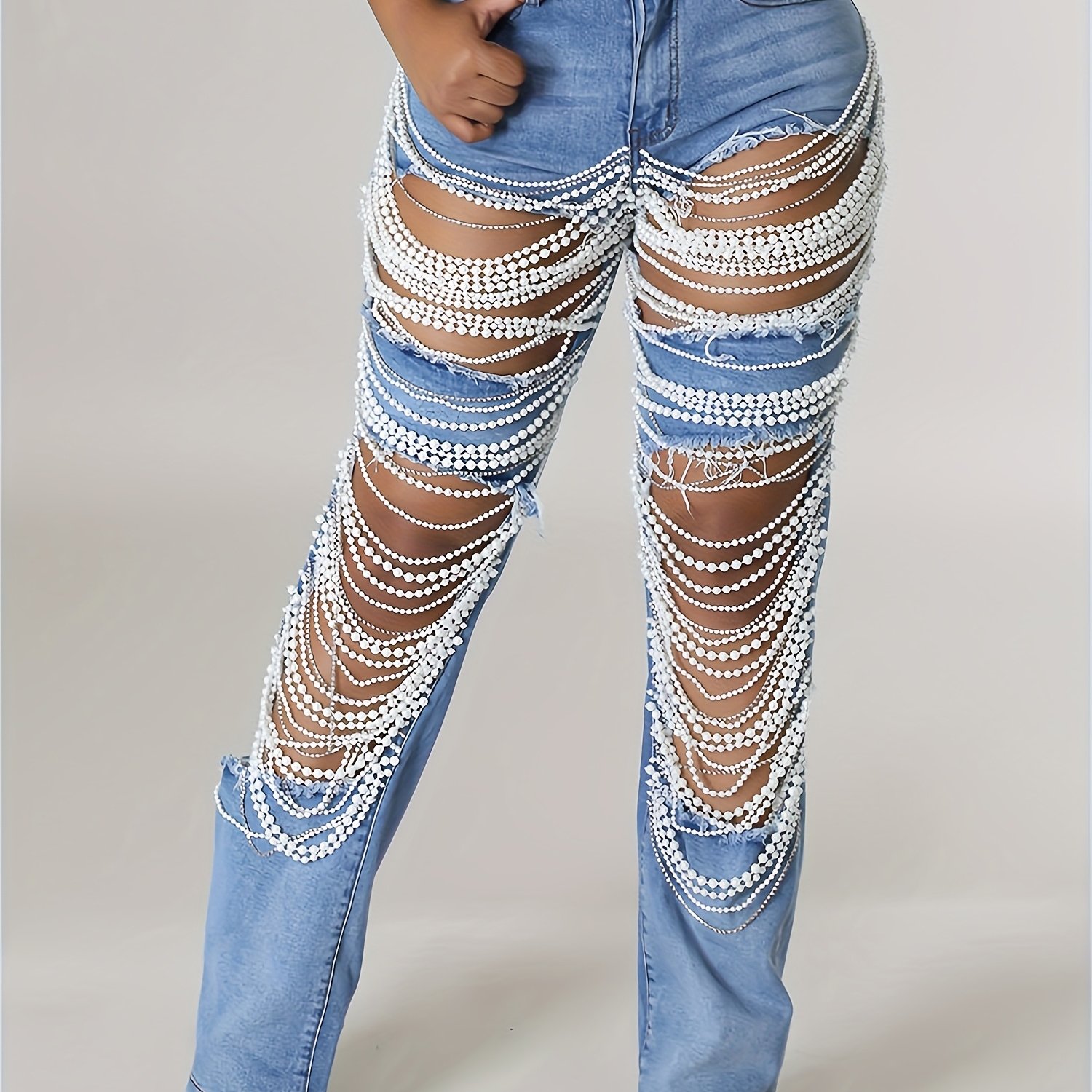 Women's Stylish Mid-Rise Straight Leg Jeans with Pearl Chain Fringe - Sexy Distressed Denim Pants for Casual Streetwear, Light Blue Denim with White Pearl Accents