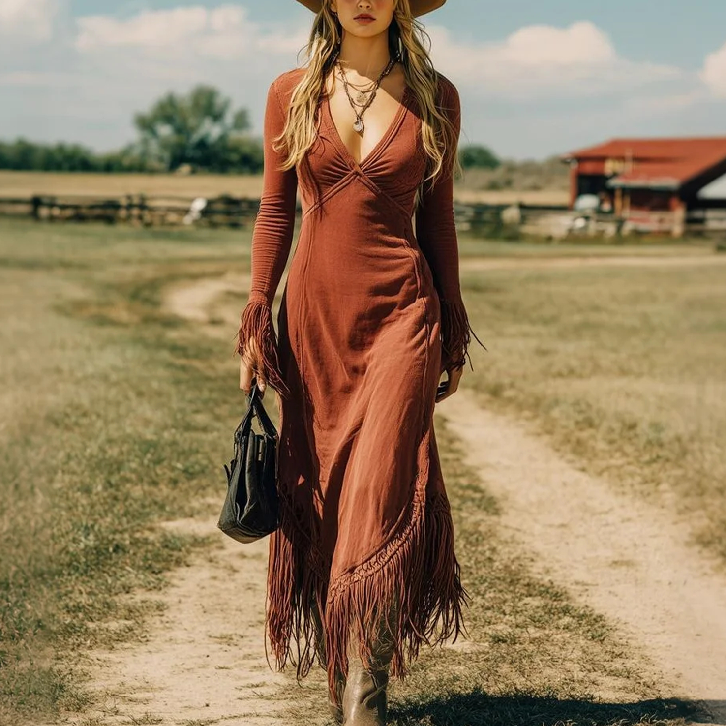 • Design Elements: Deep V-neckline, fringe detailing along the hem and sleeves, layered necklaces