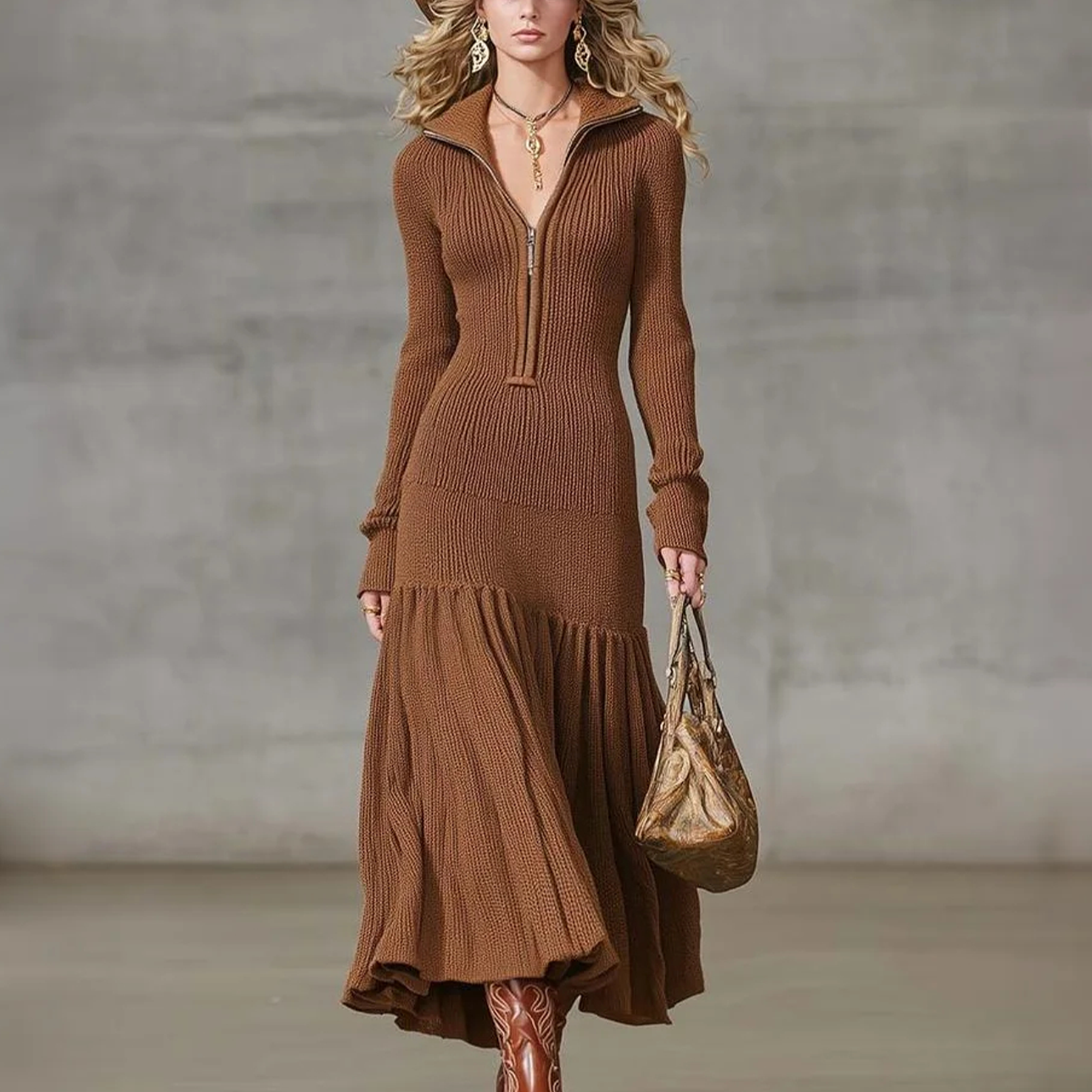 Women's Vintage Brown Knitted Maxi Dress With Cowboy Hat And Boots