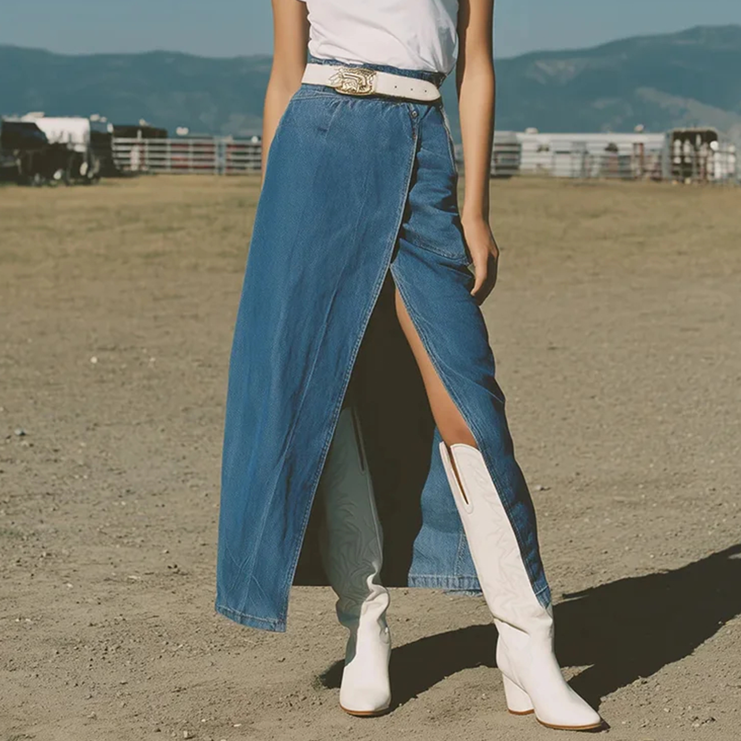 • Design Elements: High slit design, white belt with decorative buckle, white cowboy boots