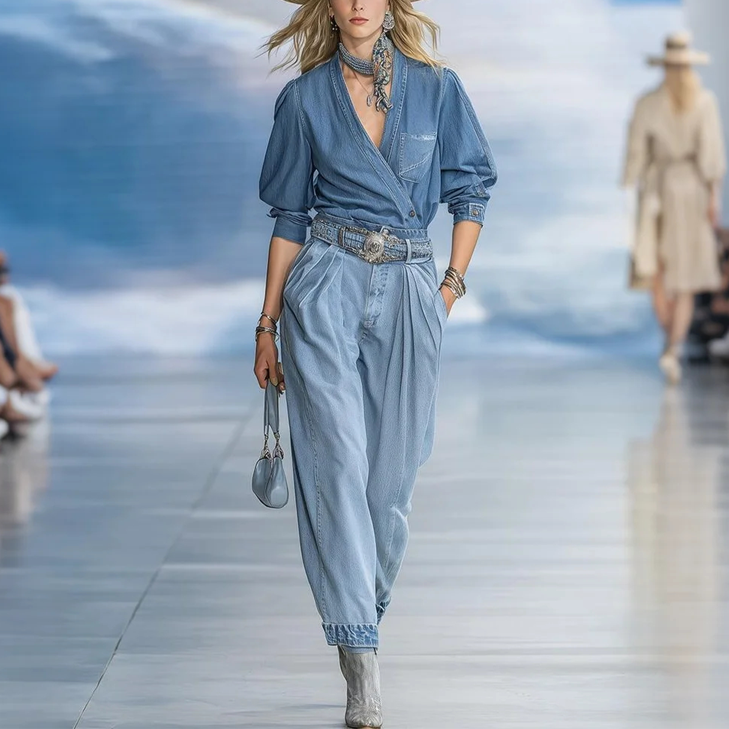Women's Vintage Denim Elegance: A Stylish Summer Jumpsuit With A Straw Set