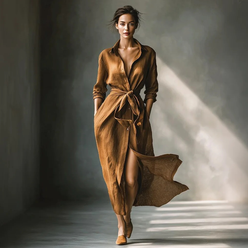 Step into a wardrobe staple with the Women's Vintage Elegant Brown Linen Dress, crafted from soft, breathable linen with flowing sleeves for a graceful, airy look. The button-down front, side slit, and tie belt at the waist create a versatile silhouette perfect for casual outings, office wear, or semi-formal events. A dress designed for comfort, style, and effortless charm.