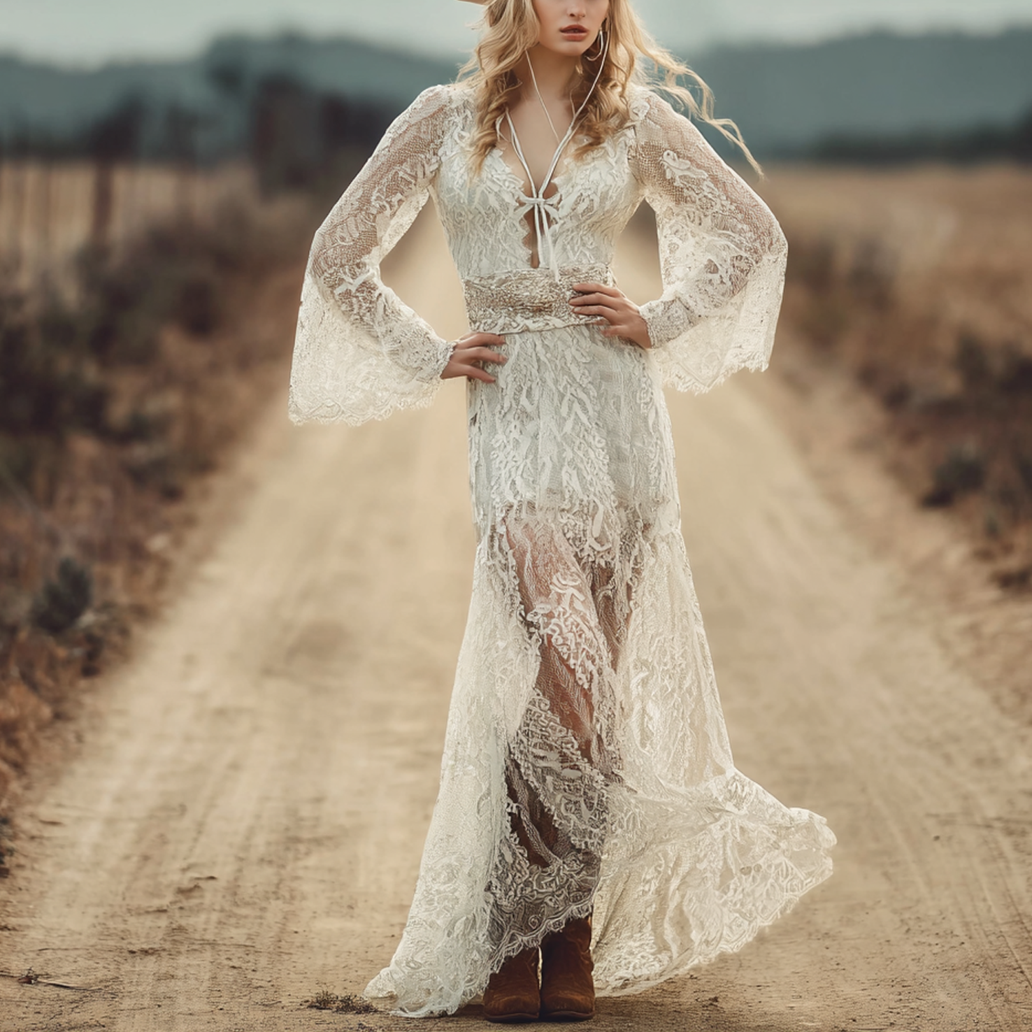🤍 Women's Vintage Elegant Lace Gown Dress — A Blend of Boho and Western Style