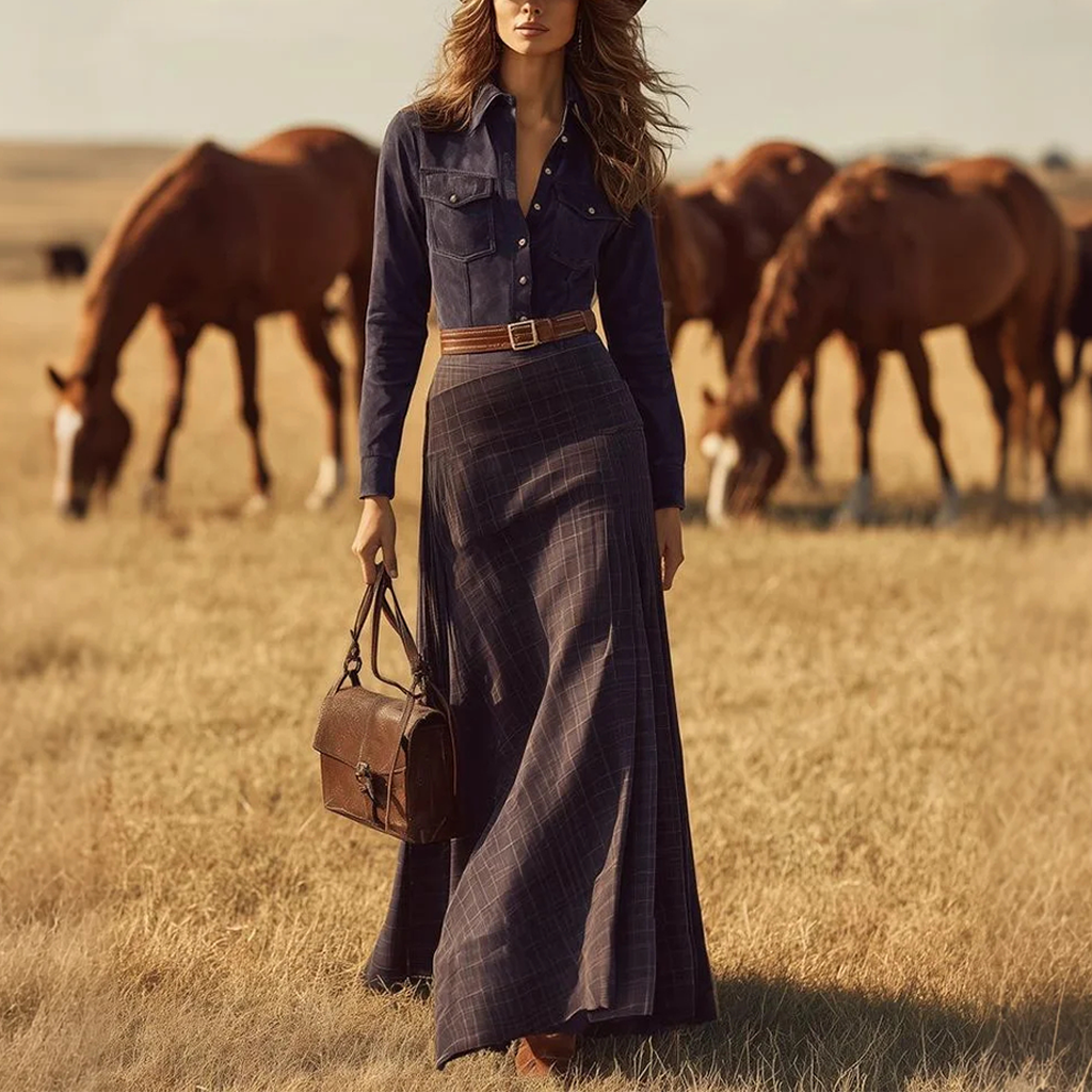 Embrace the charm of vintage western fashion with this versatile two-piece set. Perfect for fall and spring, it’s ideal for casual outings, countryside events, or photoshoots. The combination of a plaid maxi skirt and denim shirt with a classic collar brings effortless style and practicality together.