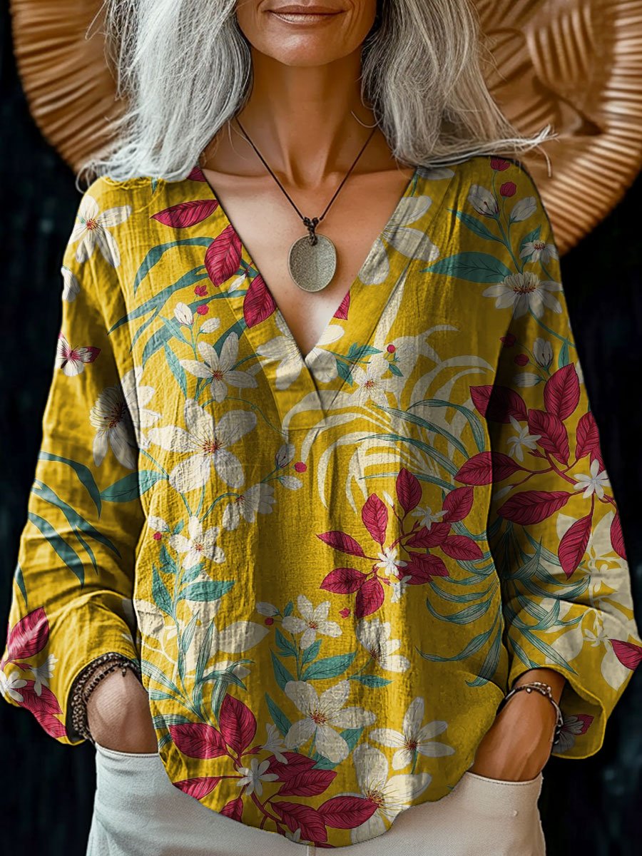 Women's Vintage Floral Art Print Casual Cotton And Linen V-neck Shirt