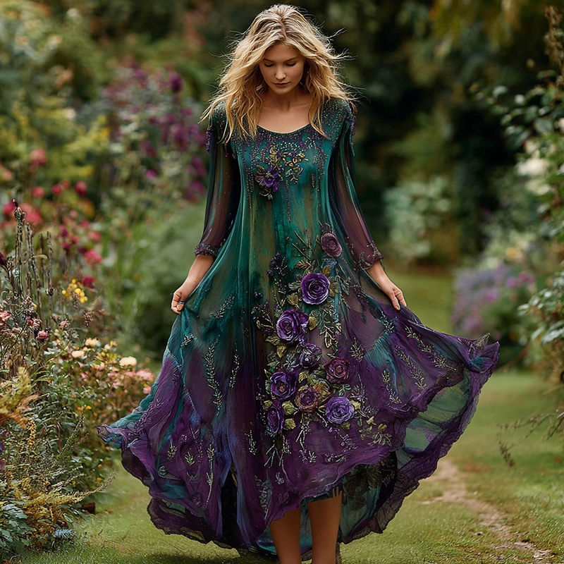 Women's Vintage Floral Embroidery Gradient Pattern Round Neck Long Sleeve Dress