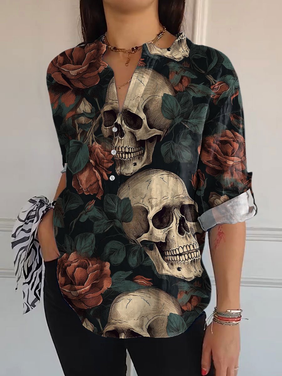 Women's Vintage Floral Skull Print Casual Long Sleeve Comfortable Cotton Shirt