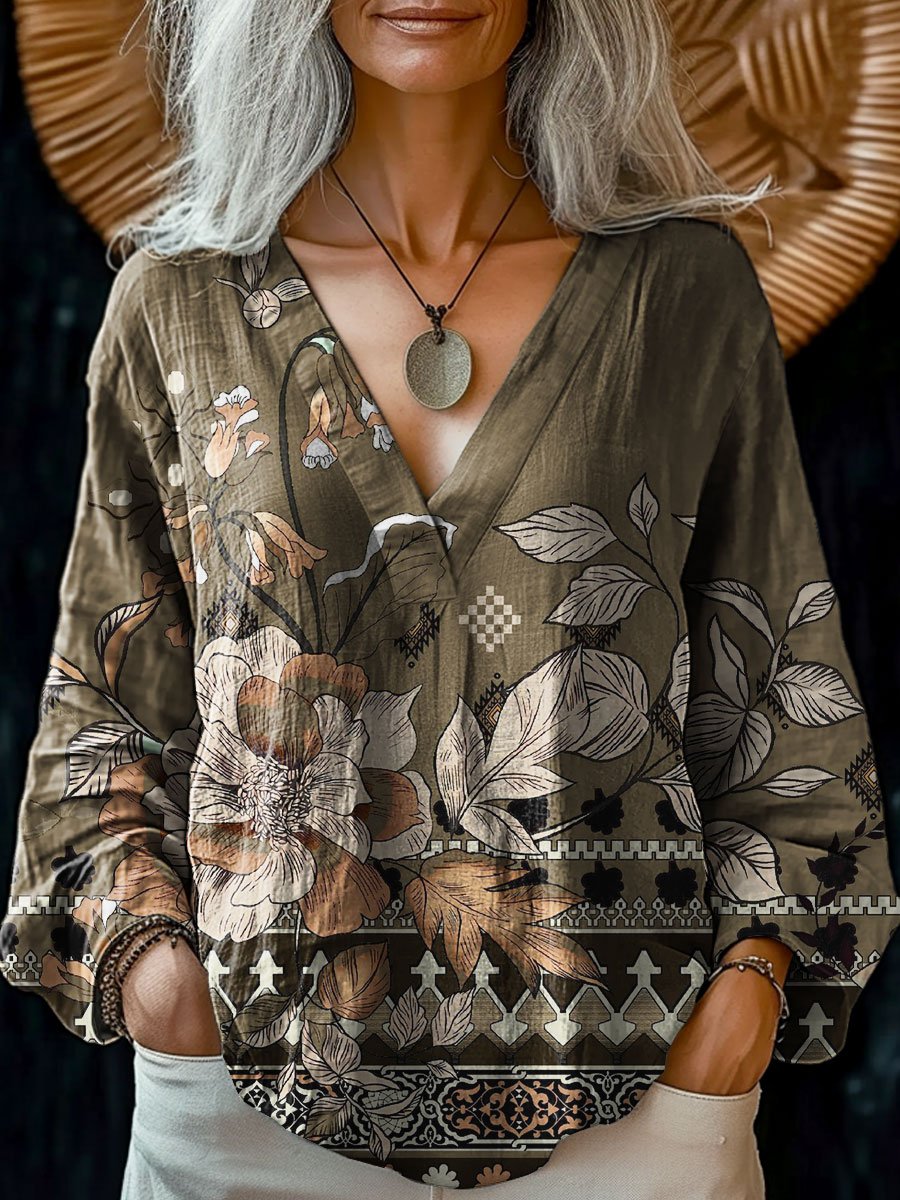 Women's Vintage Flower Art Print Casual Cotton And Linen V-neck Shirt