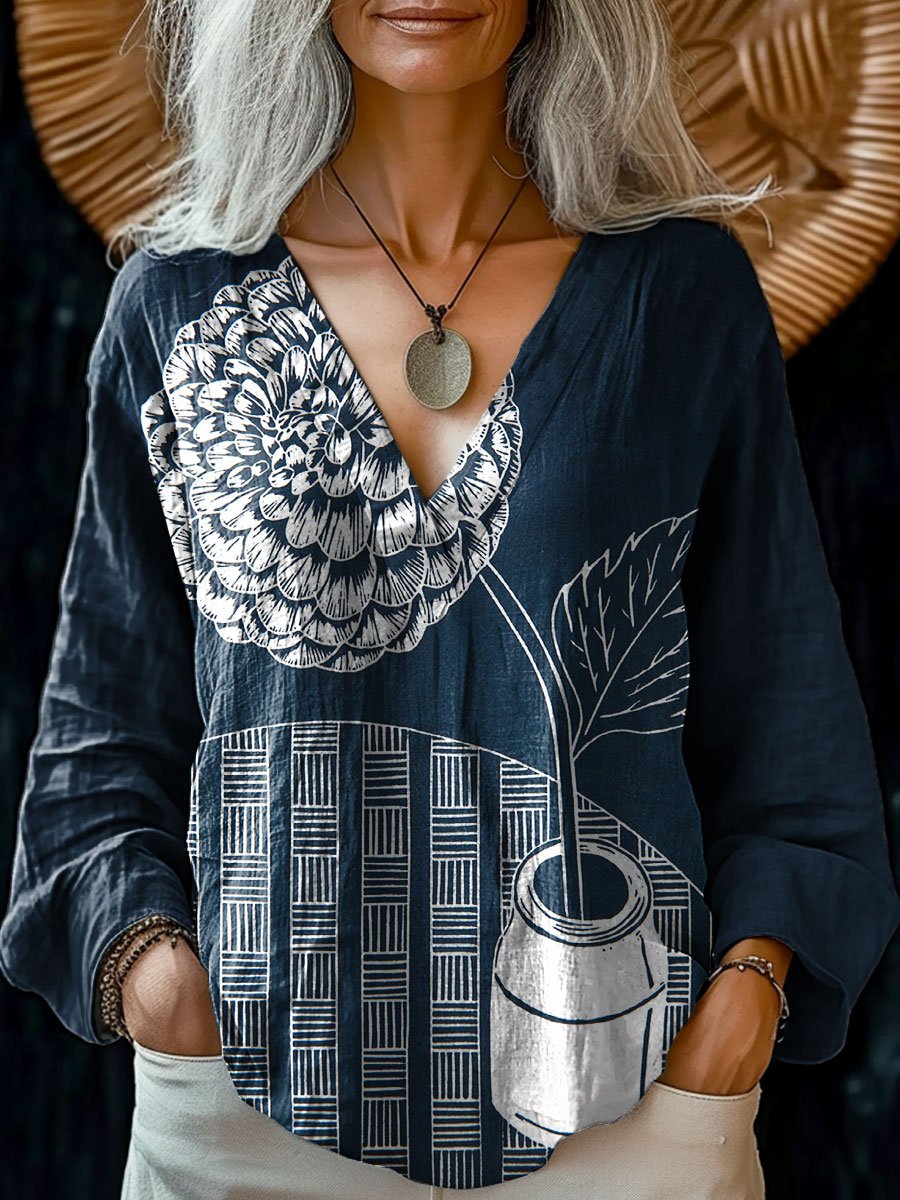 Women's Vintage Flower Art Print Casual Cotton And Linen V-neck Shirt