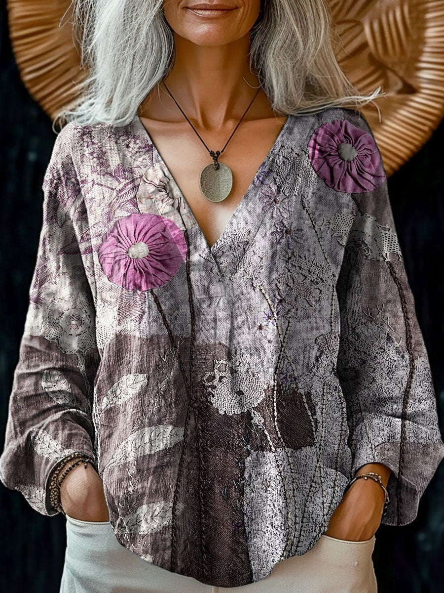 Women's Vintage Flower Art Print Casual Cotton And Linen V-neck Shirt