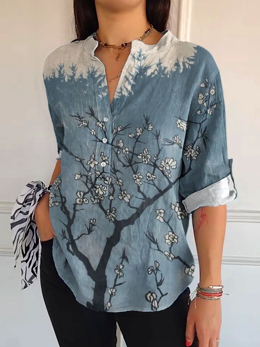 Women's Vintage Flower Art Print Casual Long Sleeve Comfortable Cotton Shirt