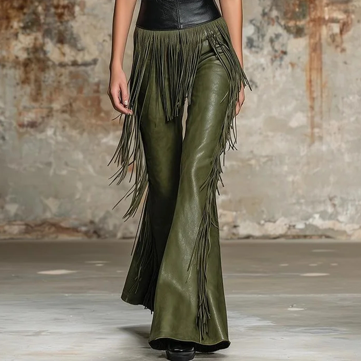 Women's Vintage Fringed Olive Green Leather Flare Pants With Black Top