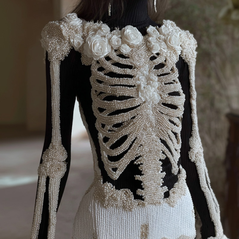 Women's Vintage Halloween Skeleton Bones With Rose Art Cozy Knit Mini Sweater Dress