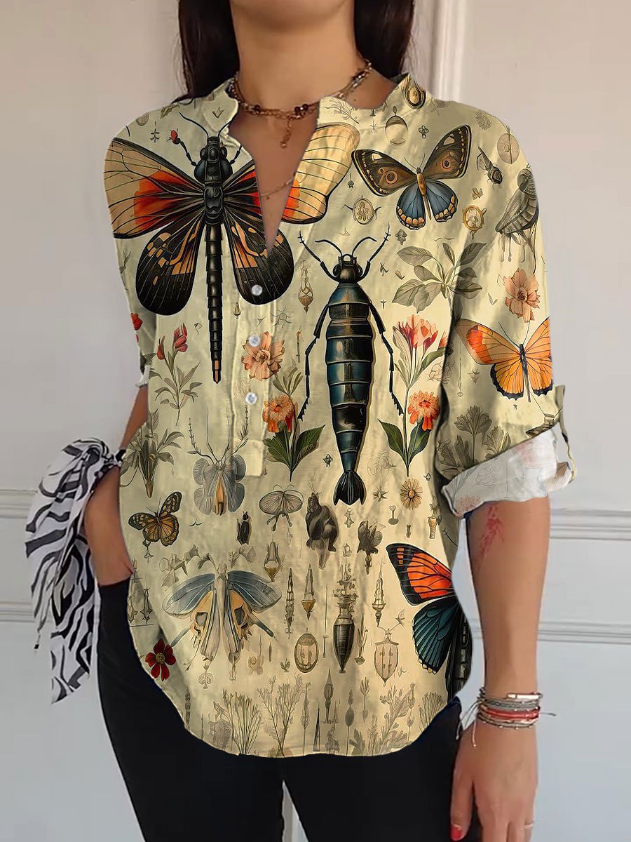 Women's Vintage Insect Herbarium Print Casual Long Sleeve Comfortable Cotton Shirt