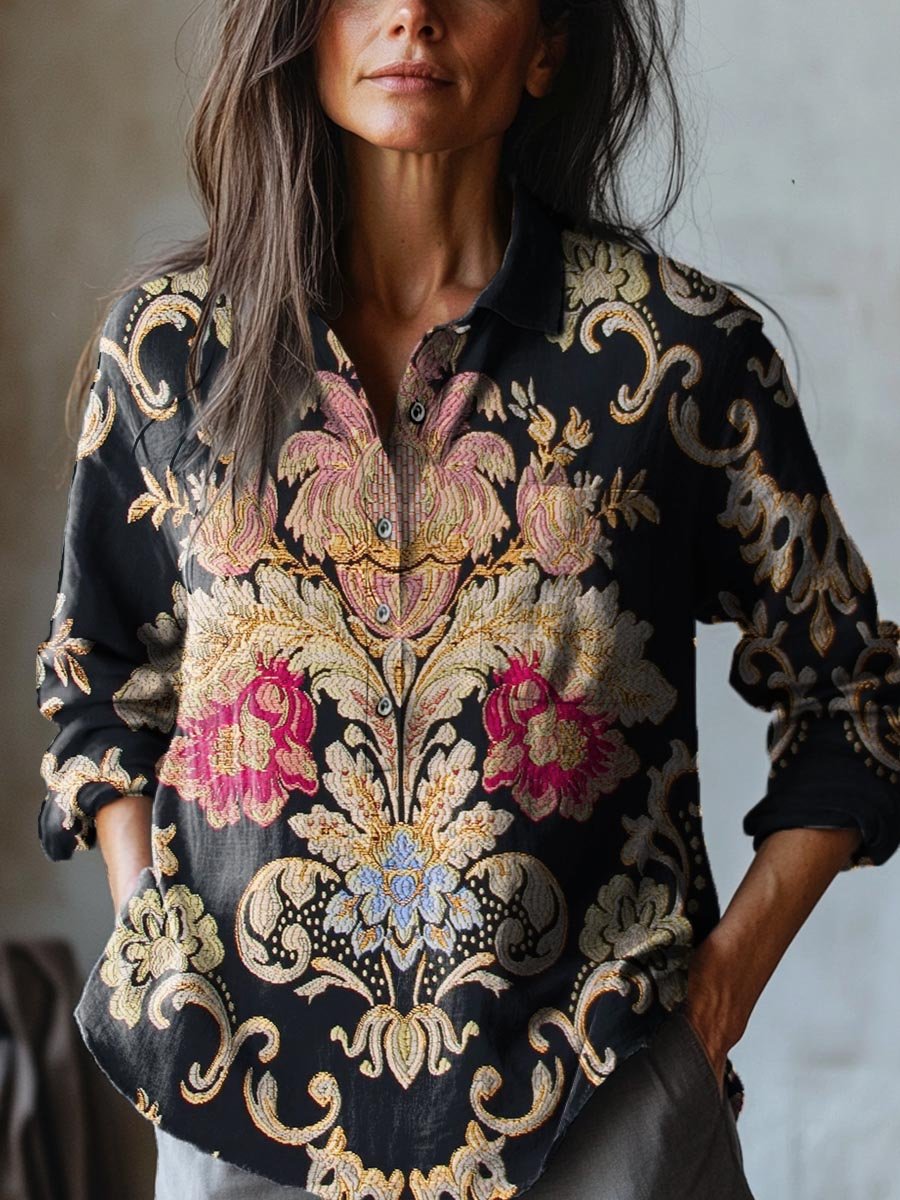 Women's Vintage Lovely Floral Art Print Casual Cotton And Linen Shirt
