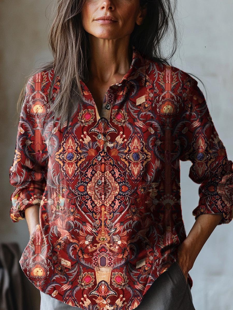 Women's Vintage Lovely Floral Art Print Casual Cotton And Linen Shirt