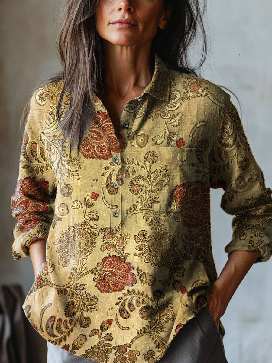 Women's Vintage Lovely Floral Art Print Casual Cotton And Linen Shirt