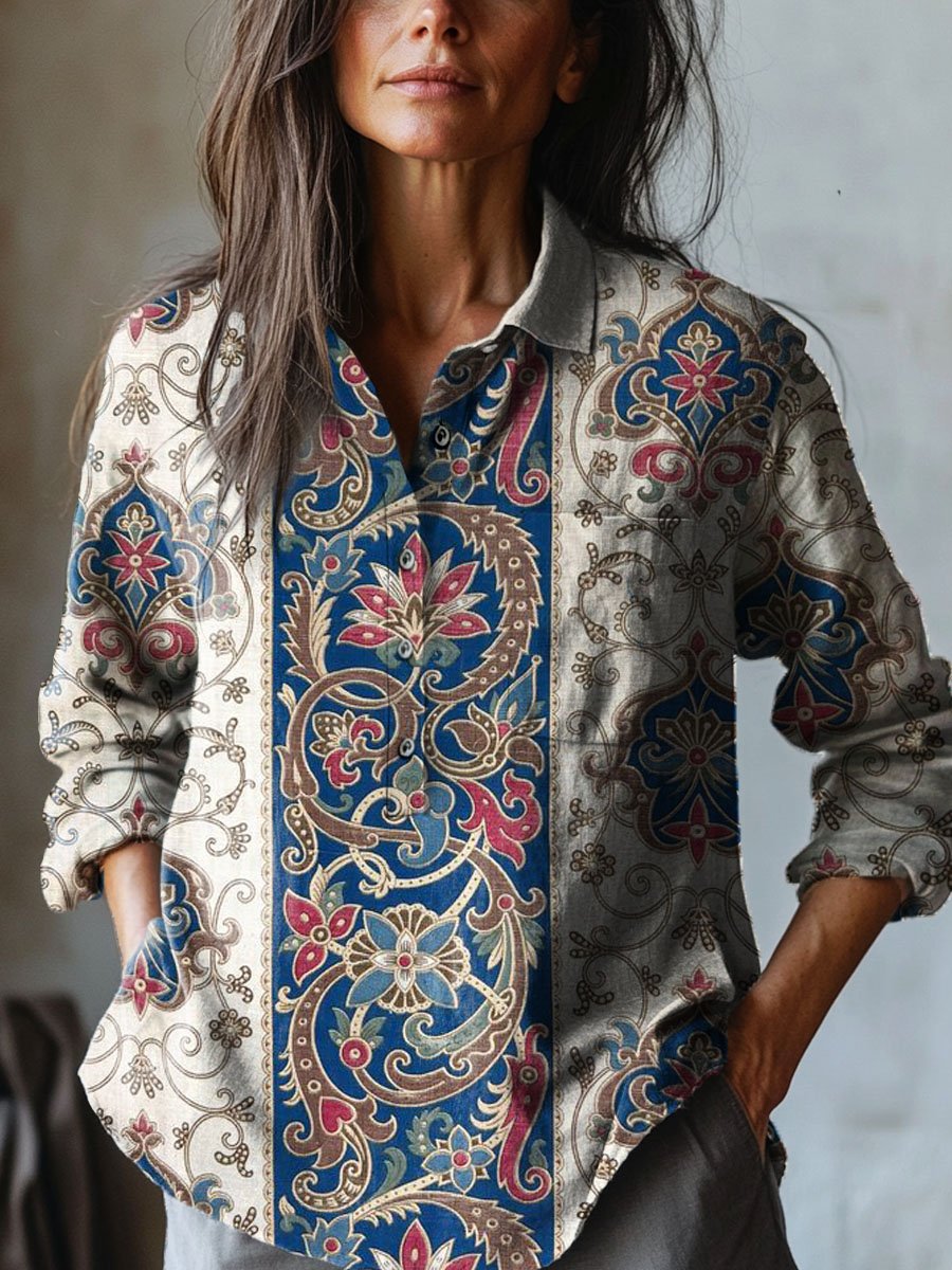 Women's Vintage Lovely Floral Art Print Casual Cotton And Linen Shirt
