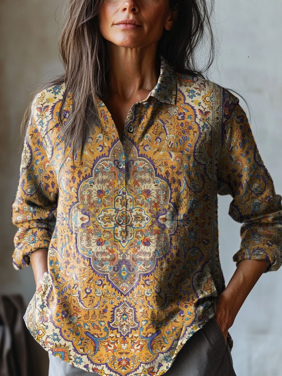 Women's Vintage Lovely Floral Art Print Casual Cotton And Linen Shirt