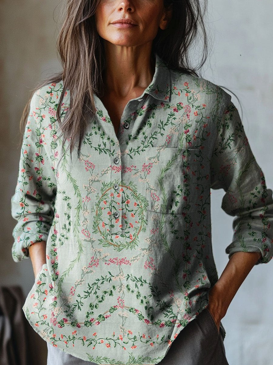 Women's Vintage Lovely Floral Art Print Casual Cotton And Linen Shirt