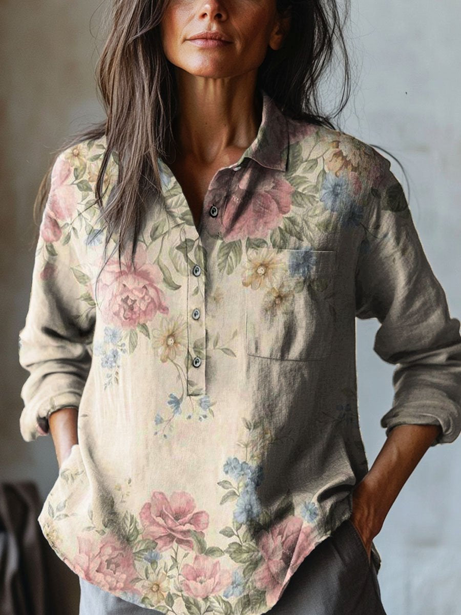 Women's Vintage Lovely Floral Art Print Casual Cotton And Linen Shirt