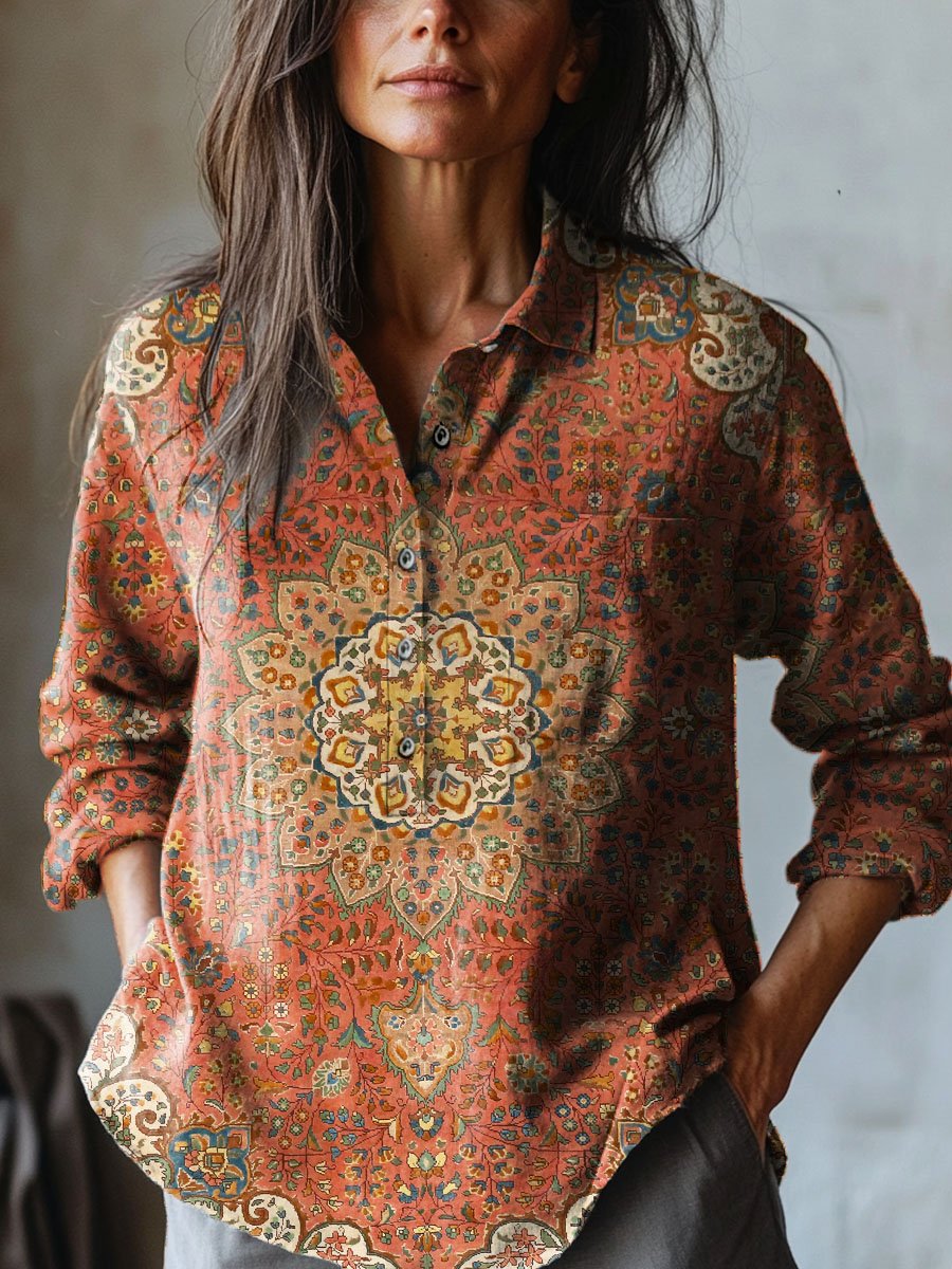 Women's Vintage Lovely Floral Art Print Casual Cotton And Linen Shirt