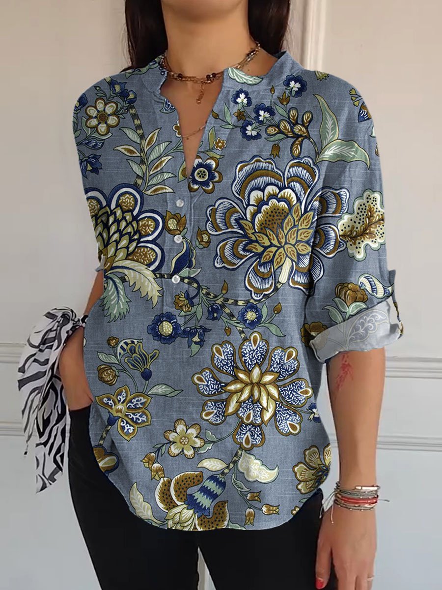 Women's Vintage Lovely Floral Art Print Casual Long Sleeve Comfortable Cotton Shirt