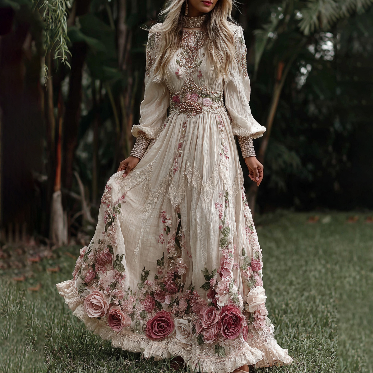 🌹 Women's Vintage Roses Embroidery Art Crew Neck Long Sleeves Maxi Dress