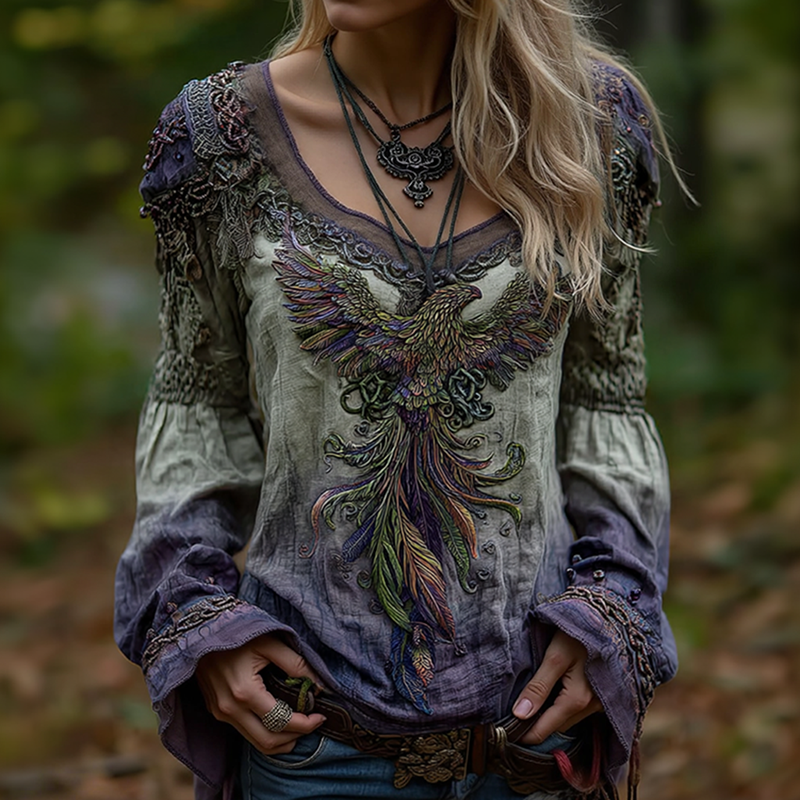 Women's Vintage Viking Celtic Knot Phoenix Art Pattern Linen Shirt
