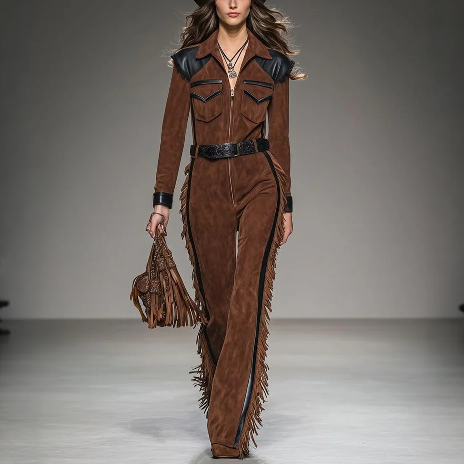Women's Vintage Western-Inspired Fringed Jumpsuit With Leather Accents